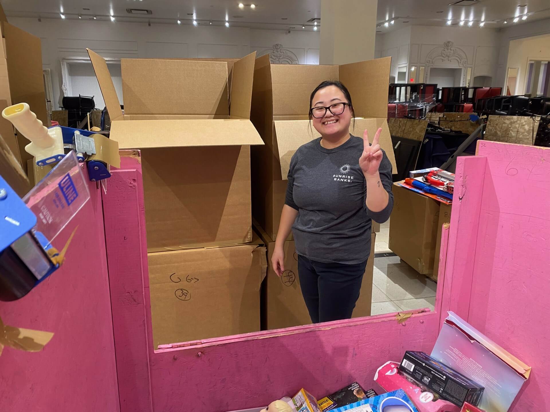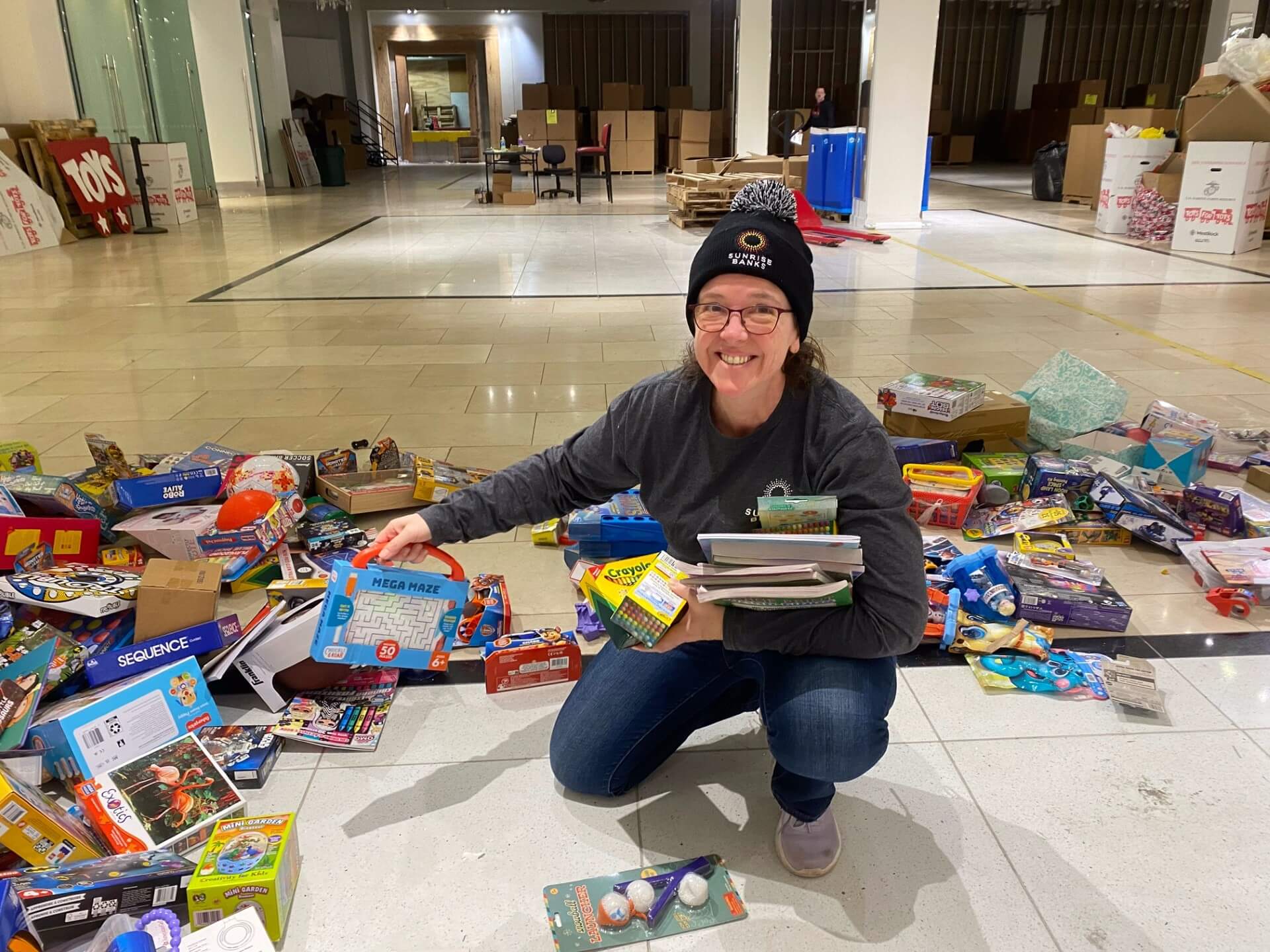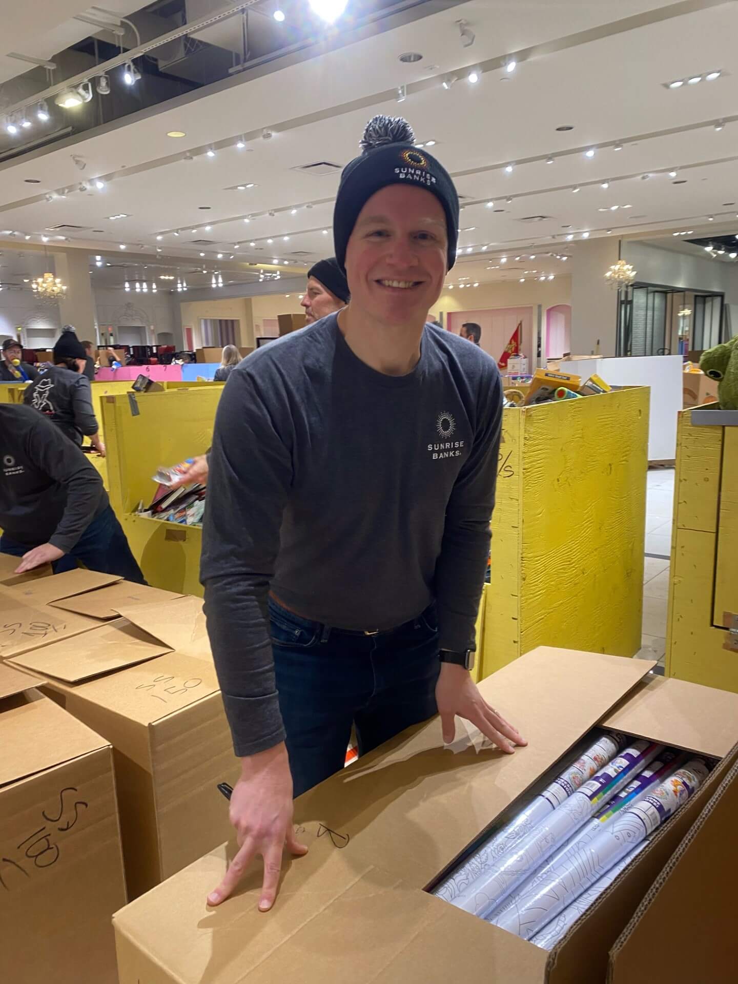 In addition to collecting toys and donations, several Sunrise Banks employees volunteered at the Toys for Tots warehouse at Mall of America. There, they sorted piles and piles of donated toys, then boxed them to send to organizations that distributed them to families in need.