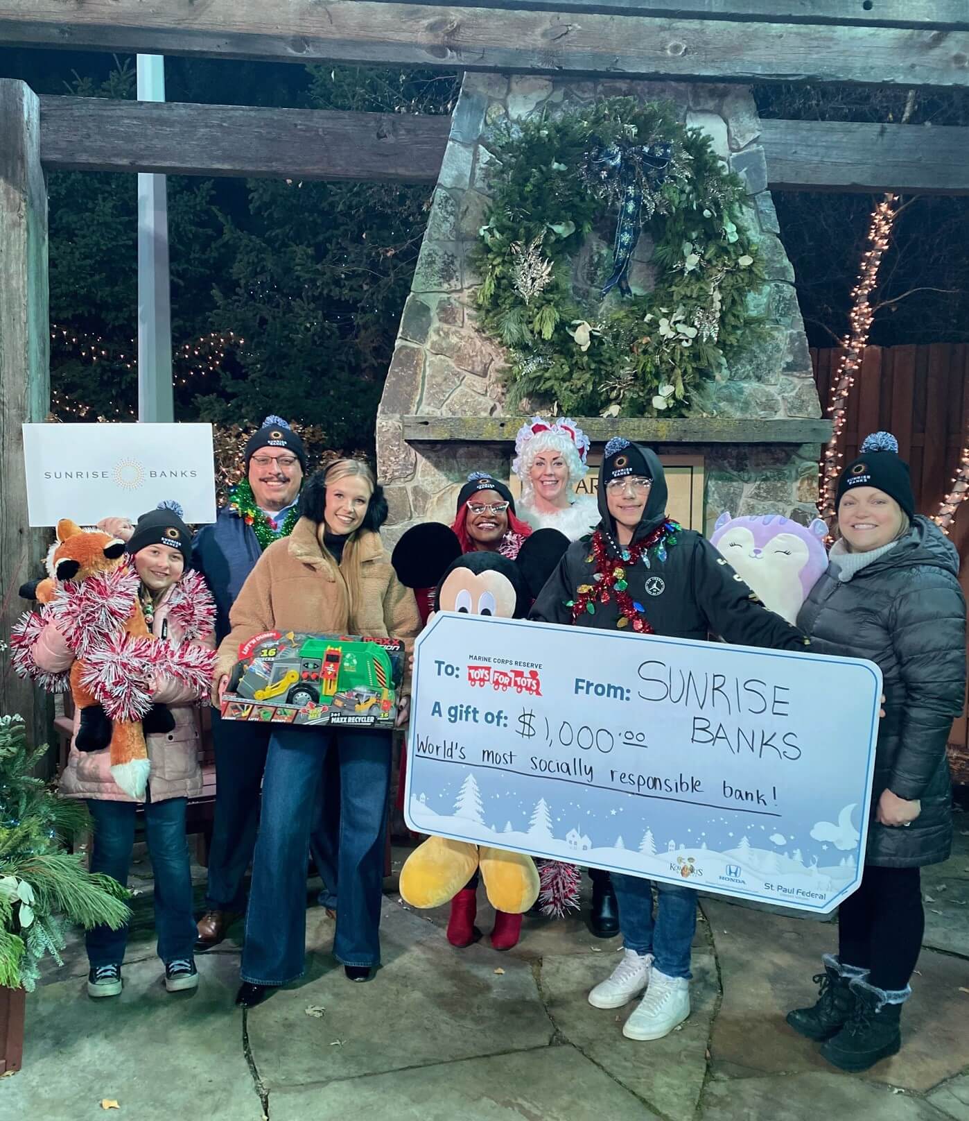 The team at Sunrise Banks takes pride in supporting our communities, especially during the holiday season. This year, Sunrise employees and customers teamed up to donate more than 600 toys and $1,475 in cash to the Toys for Toys campaign, sponsored by the Marine Toys for Tots Foundation.